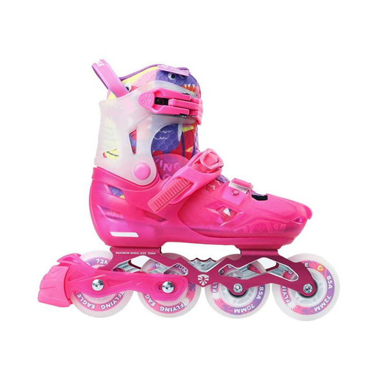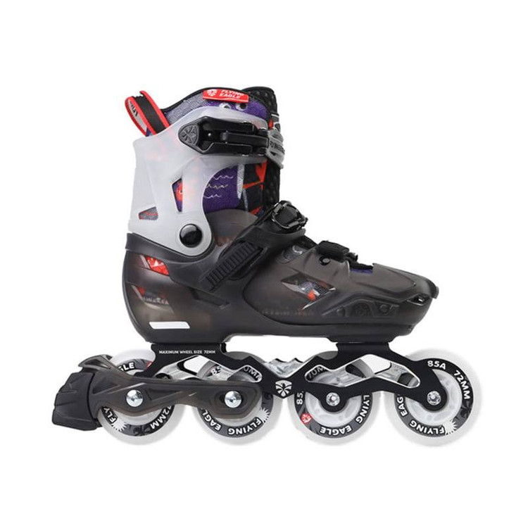 امروزه کفش اسکیت فلایینگ ایگل با استقبال زیادی از طرف مشتریان روبرو شده؛ یکی از این دلایل شاید بتوان کیفیت بالای این برند و هم چنین وجود مدل های متنوع و براورده کردن نیازهای مختلفی از ورزشکاران دانست، برند فلاینگ ایگل تکنولوژی کشور اسپانیا می باشد. این برند در قسمت اسکیت بزرگسالان و هم اسکیت های متغیر کودکان به خوبی عمل کرده است و می توان این برند را یکی از موفق ترین برندهای دنیای اسکیت دانست. بدنه اسکیت کاملا هارد از پلاستیک فشرده و متریال پلی پریلین می باشد. وجود یک برجستگی کنار بوت به عنوان ضربه گیر اسکیت می باشد. وجود قابلیت شب تاب در قسمت پشت ساق پا که در مکان های کم نور روشن می شود باعث ایمنی اسکیت سوار میشود دارای چرخ های چراغدار هالوژنی می باشد که در شب زیبایی خاصی دارد. دارای ترمز روی کفش سمت چپ که قابلیت جداساری دارد. جوراب قابل شستشو، قابل تعویض و ضخیم برای راحتی پا و جلوگیری از ضربات به پا. جنس بلبرینگ استفاده شده در این نوع از نوع ABEC 7 می باشد و از فلز کروم ساخته شده است یک انتخاب عالی برای الیاژ مورد استفاده در این اسکیت است و مقاومت بالایی دارد.