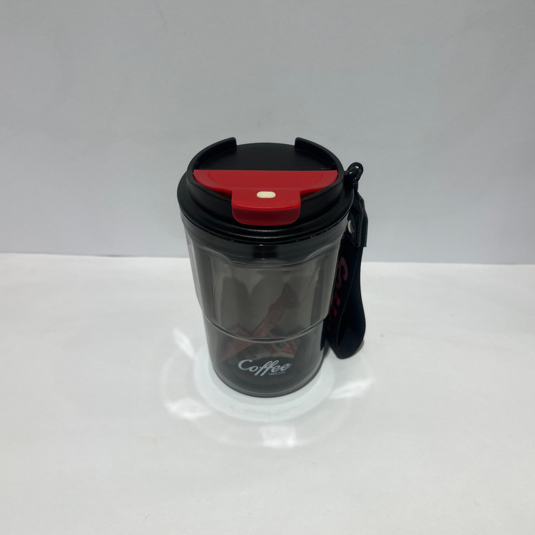 این لیوان قهوهخوری با طراحی شفاف و مشکی و درب قرمز، انتخابی شیک و کاربردی برای دوستداران قهوه است. دارای بند حمل بوده که روی آن واژه *Coffee* به رنگ قرمز چاپ شده است.