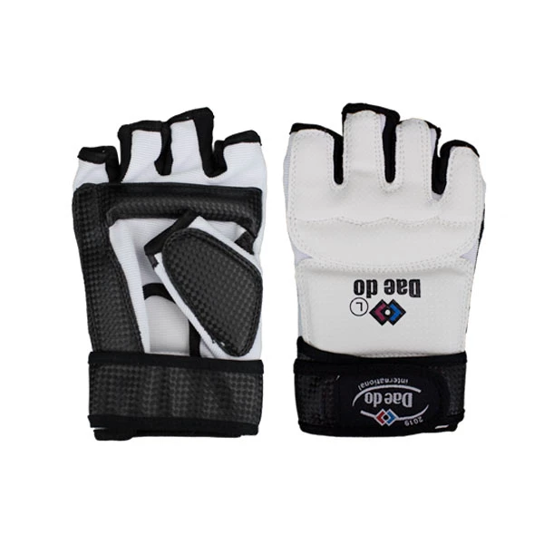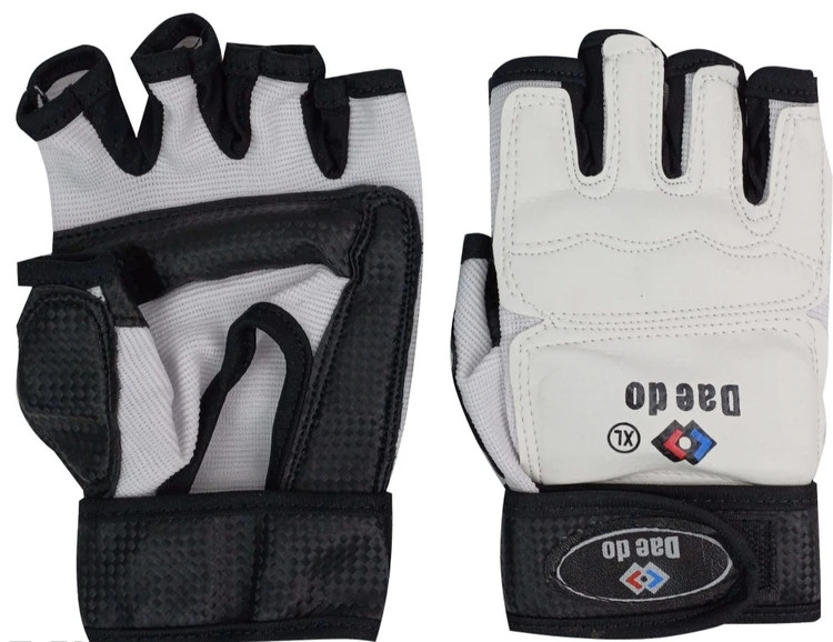 یکی از تجهیزات ایمنی که در سالیان اخیر توسط ورزشکاران رشته تکواندو در مبارزان مورد استفاده قرار می گیرد ، دستکش نیم پنجه تکواندو می باشد.این دستکش ها که از جنس فوم می باشند دارای کف پارچه ای استرج بوده و هنگام مبارزه یا تمرین مشکلی برای ورزشکار ایجاد نمی کند . دستکش تکواندو طرحDaedo دارای کیفیتی مشابه نمونه اصلی و قیمتی به مراتب اقتصادی تر از آن می باشد .