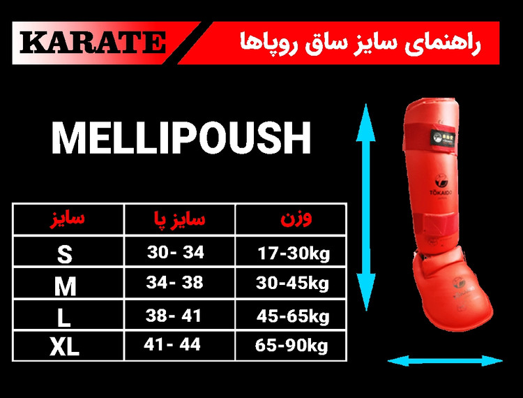 محافظ ساق و روپایی کاراته برای تمامی سنین از رده سنی ۱۰ سال تا بزرگسالان قابل استفاده است زیرا در سه سایز: (متوسط، بزرگ و خیلی بزرگ) موجود است و شما می توانید از قسمت بالا سایز خود را انتخاب کرده و این محصول را تهیه کنید. گفتنی است که ساق روپایی کاراته به صورت جفت بوده و در رنگ های آبی و قرمز تولید و به فروش می رسد تا بتوانید در مسابقات و تمرینات خود را به راحتی از آنها استفاده کنید.