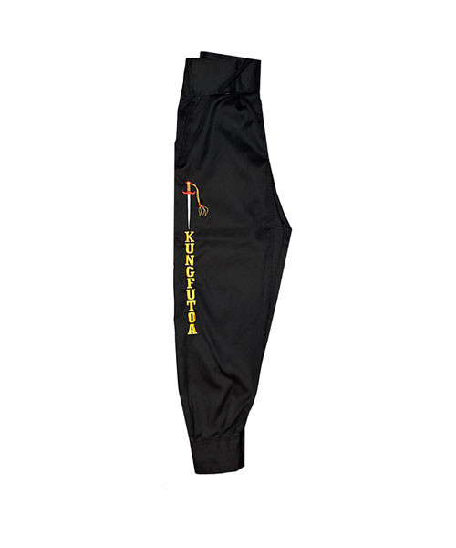 این شلوار ، گشاد و راحت است و امکان انعطاف و سهولت حرکت را فراهم می کند. به منظور محافظت از کمر ، در شلوار این ست کمری پهن و محکم به کار رفته شده است که به طرز خاصی بسته می شود. در قسمت مچ پا شلوار نیز از نواری محکم و پهن و چسبی جهت محافظت و جلوگیری از آسیب، استفاده شده است. در قسمت جلو پیراهن یک شمشیر و در پشت آن لوگوی کونگ فو TOA گلدوزی شده است و بر روی شلوار نیز علامت شمشیر و عبارت کونگ فو TOA گلدوزی شده است. لباس کونگ فو TOA دارای کیفیت دوخت استاندارد و عالی و سایزبندی برای سنین مختلف می باشد.