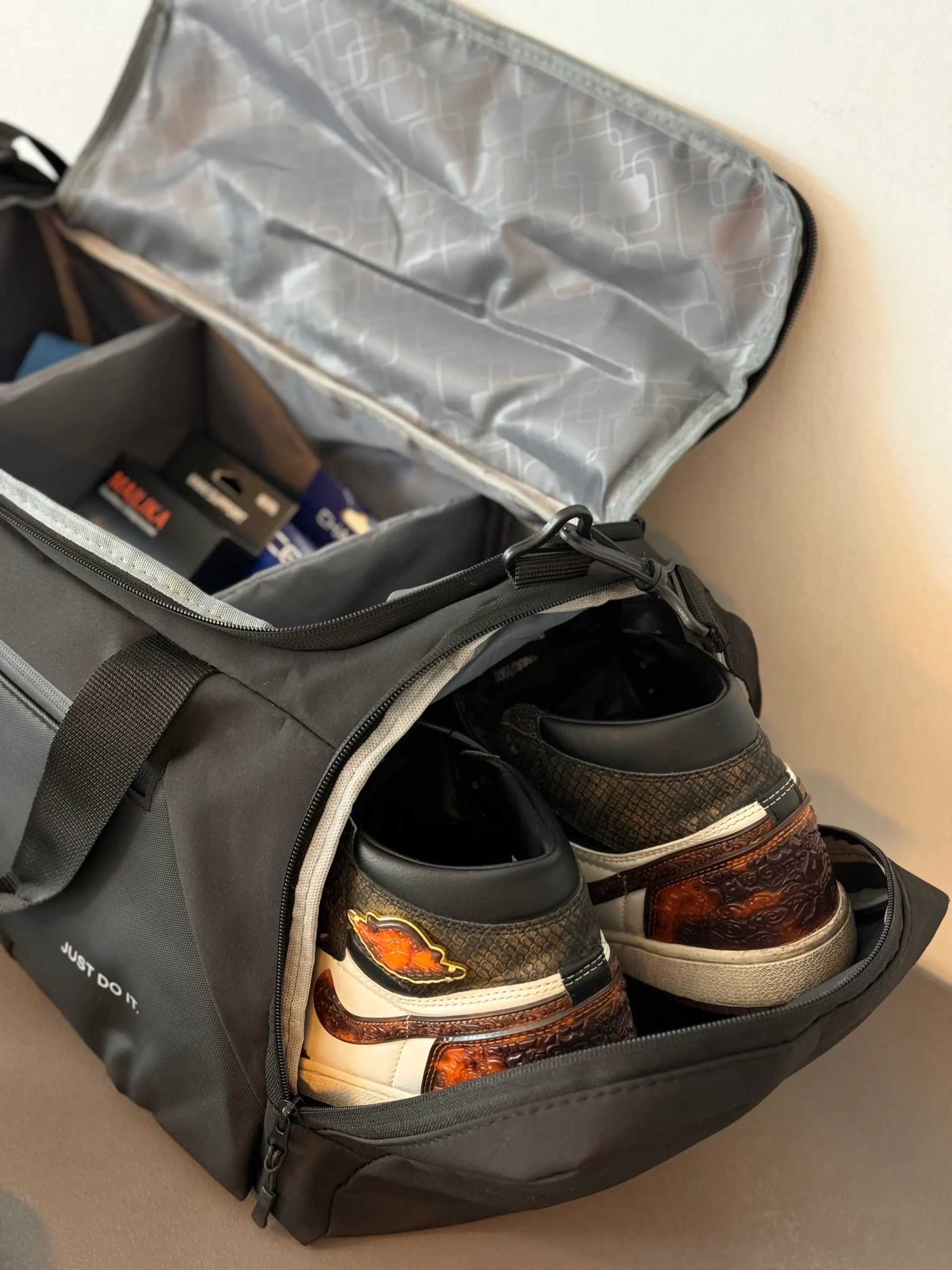 داخل کیف بهصورت هوشمندانه تفکیک شده است: یک بخش اصلی بزرگ برای لباس و لوازم، یک محفظه زیپدار ته کیف مخصوص کفش که از بقیه فضا جداست، و چند جیب داخلی برای نظمدهی لوازم کوچک. تقسیمکنندههای داخلی قابل جابجایی یا جدا شدن هستند تا بسته به نیاز فضای بیشتری یا کمتری داشته باشید.