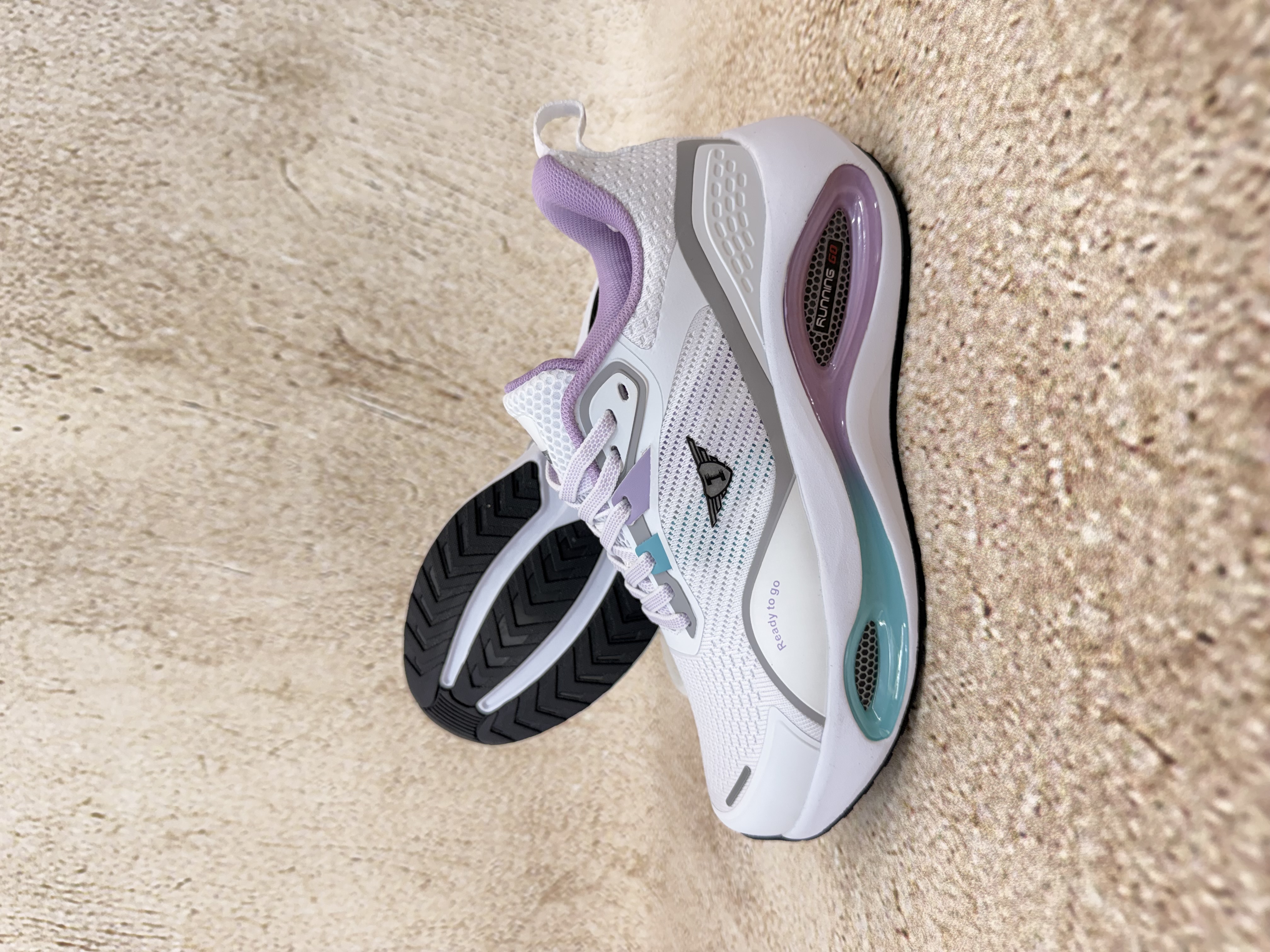 زیره با طراحی Air-Flex Dual Cushion دارای دو محفظه هوایی در قسمت پاشنه و پنجه است که ضربه را جذب کرده و فشار را در طول دویدن کاهش میدهد. ترکیب رنگ سفید، بنفش، فیروزهای و طوسی جلوهای مدرن و انرژیبخش دارد.